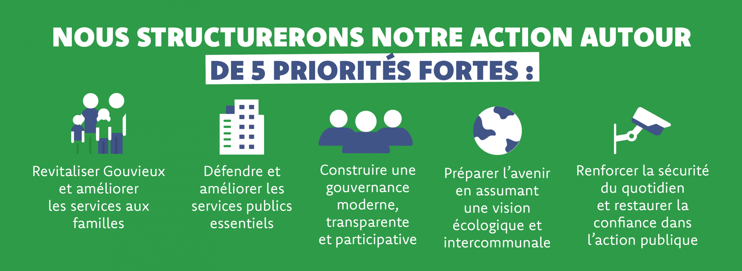 Dans un contexte national instable, Gouvieux a plus que jamais besoin d’une équipe stable, engagée, soudée, compétente et disponible, capable de relever les défis d’aujourd’hui et de préparer ceux de demain. Très bientôt, vous découvrirez des femmes et des hommes dont l’expérience, les compétences et la détermination seront des atouts essentiels pour réveiller notre commune.